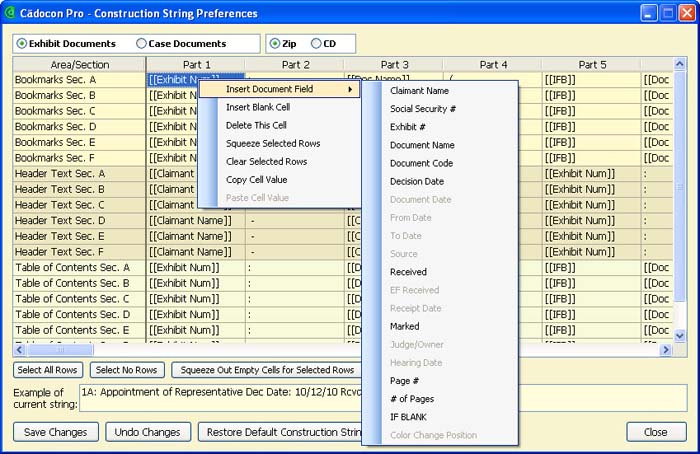 gives YOU the ability to specify how to construct the wording for bookmarks, page header text and your table of contents. Bookmarks, table of contents lines and page header text can be constructed from the fields in the SSA files as you see fit. And those settings can be different for each section if you wish. If certain pieces of information are important to show in the Section B bookmarks but not in the Section E bookmarks, then you have complete control and can decide what to show or what not to show.